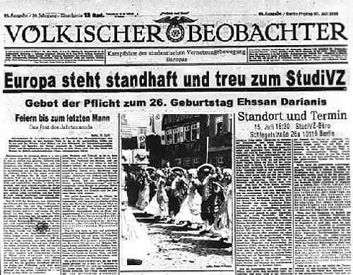 Doch er forscht weiter. Und fördert unschöne Geschäftspraktiken sowie erste persönliche Sachen von Ehhsan an den Tag. Das Video könnt ihr im vorherigen Post von mir ansehen. Der Blogger forscht weiter und findet heraus, dass die Webside "Volkischer Beobachter" von Ehssan registriert wurde. Jetzt Platzt die Bombe: Der Blogger findet heraus, das Ehssan eine Partyeinladung verschickt hat, die dem Layout der Originalzeitung voelkischer_beobachterkl (jpg, 59 KB) des Völkischen Beobachters nachempfunden ist. studivz_vbeobachter (jpg, 55 KB) Nur ein paar Schlagzeilen wurden ausgetauscht und statt des Reichsadlers mit dem Hakenkreuz oben auf der Titelseite ist dort das StudiVZ Logo platziert. Außerdem wirft sich Ehssan auch gerne mal in Pose mit ein paar coolen Sprüchen nebendran. 170333056_25cd749e4a (jpg, 118 KB) . Und wie sieht sich Ehssan selbst ? "volksnah. ewiggestrig...prophet auf allen gebieten. suche stets nach lösungen für jahrhunderte,..unermüdlicher wunderheiler geistiger zivilisationskrankheiten (ohoh, das haben wir aber auch schon mal wo gehört. ... ) Ehssan reagiert. Er will das Internet von seiner Vergangenheit reinigen und veranlasst seine Kumpels, Bilder u.a von Flicker.com zu löschen. Weiterhin versuchen die StudiVZ Leute, die Webenzyklopädie Wikipedia mit positiven Einträgen zu studVZ zu manipulieren. Weiter im plot: Der Blogger findet heraus, dass die Macher studiVZ verkaufen wollen, und zwar an facebook.com, von denen sie schon das Layout der studivz Seite abgeschaut hatten. Das aktuelle Finale: Der Blogger wird aus dem StudiVZ Umfeld angschrieben, mit der Frage, was es den "koste", wenn er seine Nachforschungen einstelle, was dieser natürlich empört ablent. Doch es kommt auch zu Kritik: Don wird von einigen Schreibern als Krawallmacher bezeichnet, der schnell auch mal auf die persönliche Ebene abgleitet. Robert Basic von Basicthinking schreibt beispielsweise zu DonAlphonso: "Er könnte ein blendender Kritiker sein, den man als ernsthaften Gesprächspartner schätzt. Wenn das Wort wenn nicht wäre. Aufgrund seiner Art zu Schreiben, [...] Man liest ihn gerne, weil seine Inhalte durchaus Hand und Fuß haben, doch es ist der Stil, der dann alles verdirbt." Wobei ich eines noch zu Dons Kritikern anmerken wollte: Es ist sehr unschön, wenn jemand, der unter Pseudonym schreibt angegriffen wird und in diesem Angriff mit richtigem Namen genannt wird. Das ist auch nicht die Ebene, auf der sich manche Blogger gerne erheben Soviel zu studiVZ, Leute. Ich bin sehr gespannt wie das weitergeht. |